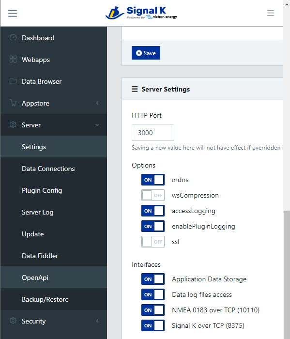Note: It is recommended that Signal K over TCP (8375) is set to On if you are using an app (e.g. Aqua Map) which supports the “Signal K over TCP” protocol as it is more feature rich.