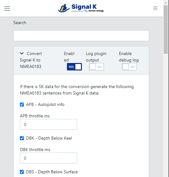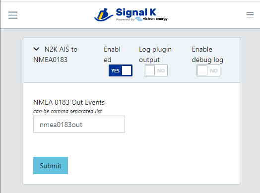 signalk-to-nmea0183 (documentation on npmjs)signalk-n2kais-to-nmea0183 (documentation on npmjs)Note: Starting with Signal K Server version 2.2.0 these plugins are pre-installed. It is recommended that these plugins be updated to the current version.